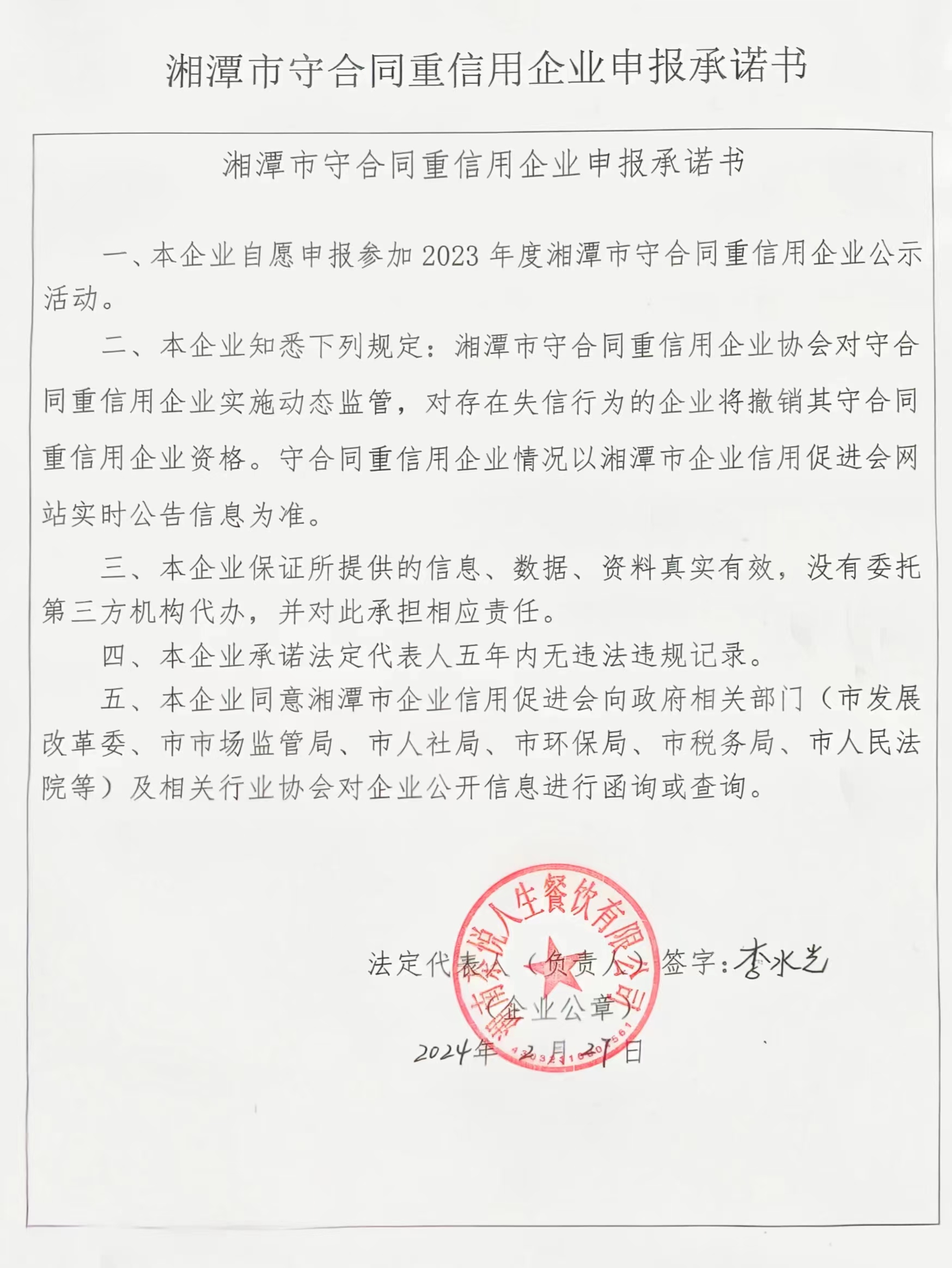 本企業(yè)根據(jù)《湘潭市守合同重信用企業(yè)申報規(guī)定》等編制 2023 年度企業(yè)信用報告書,并保證本報告書內(nèi)容真實、準(zhǔn)確、完整。