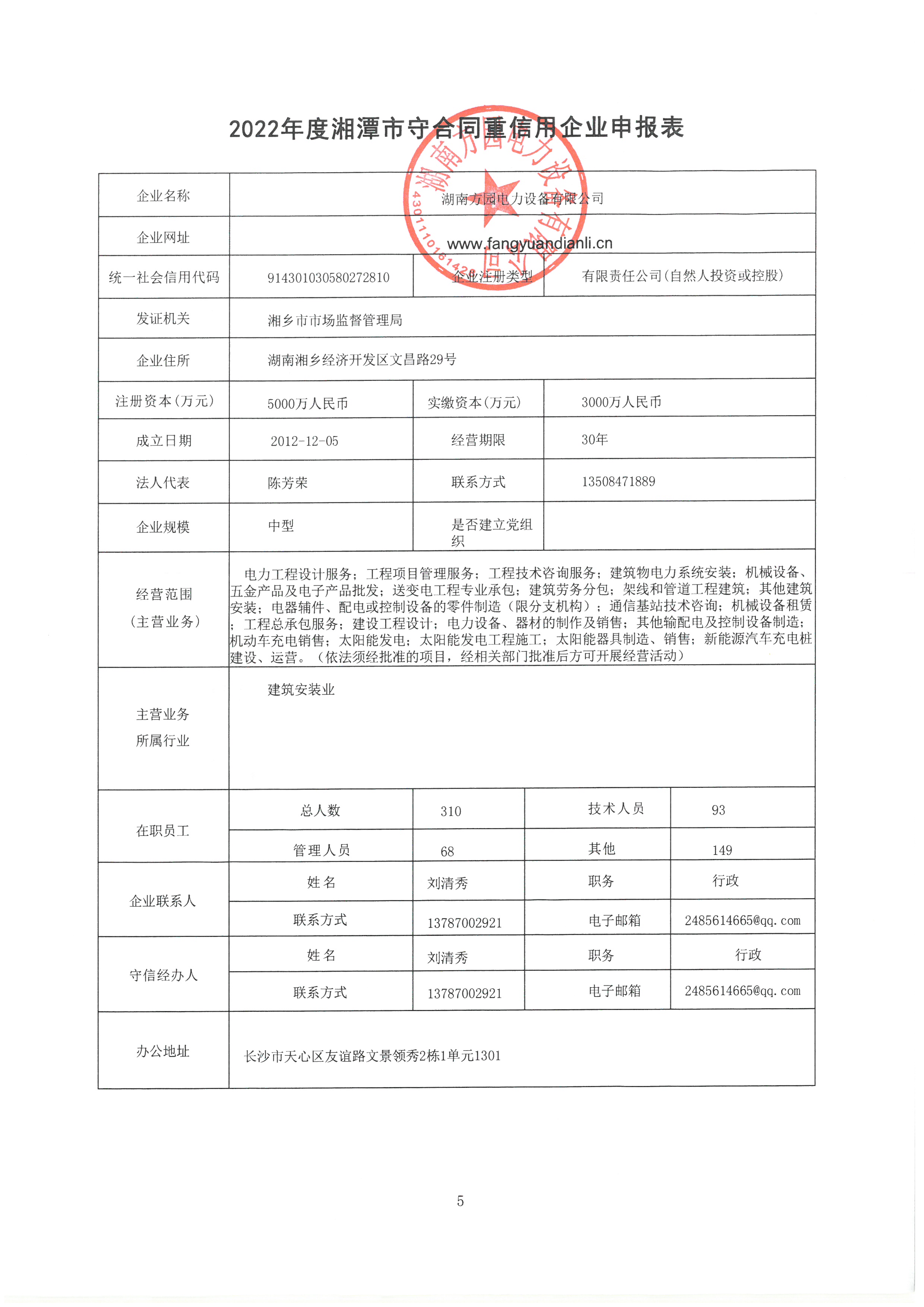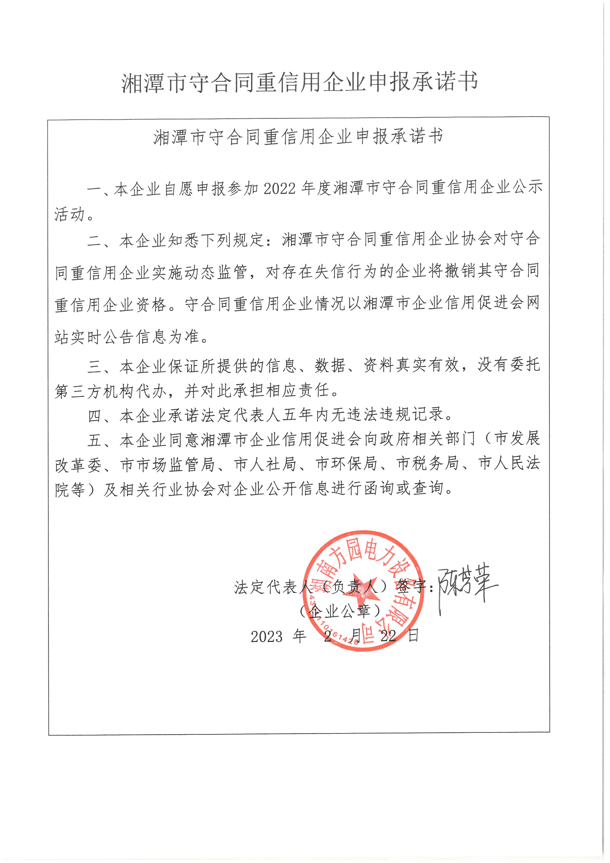 本企業(yè)根據(jù)《湘潭市守合同重信用企業(yè)申報規(guī)定》等編制 2022 年度企業(yè)信用報告書,并保證本報告書內(nèi)容真實、準(zhǔn)確、完整。