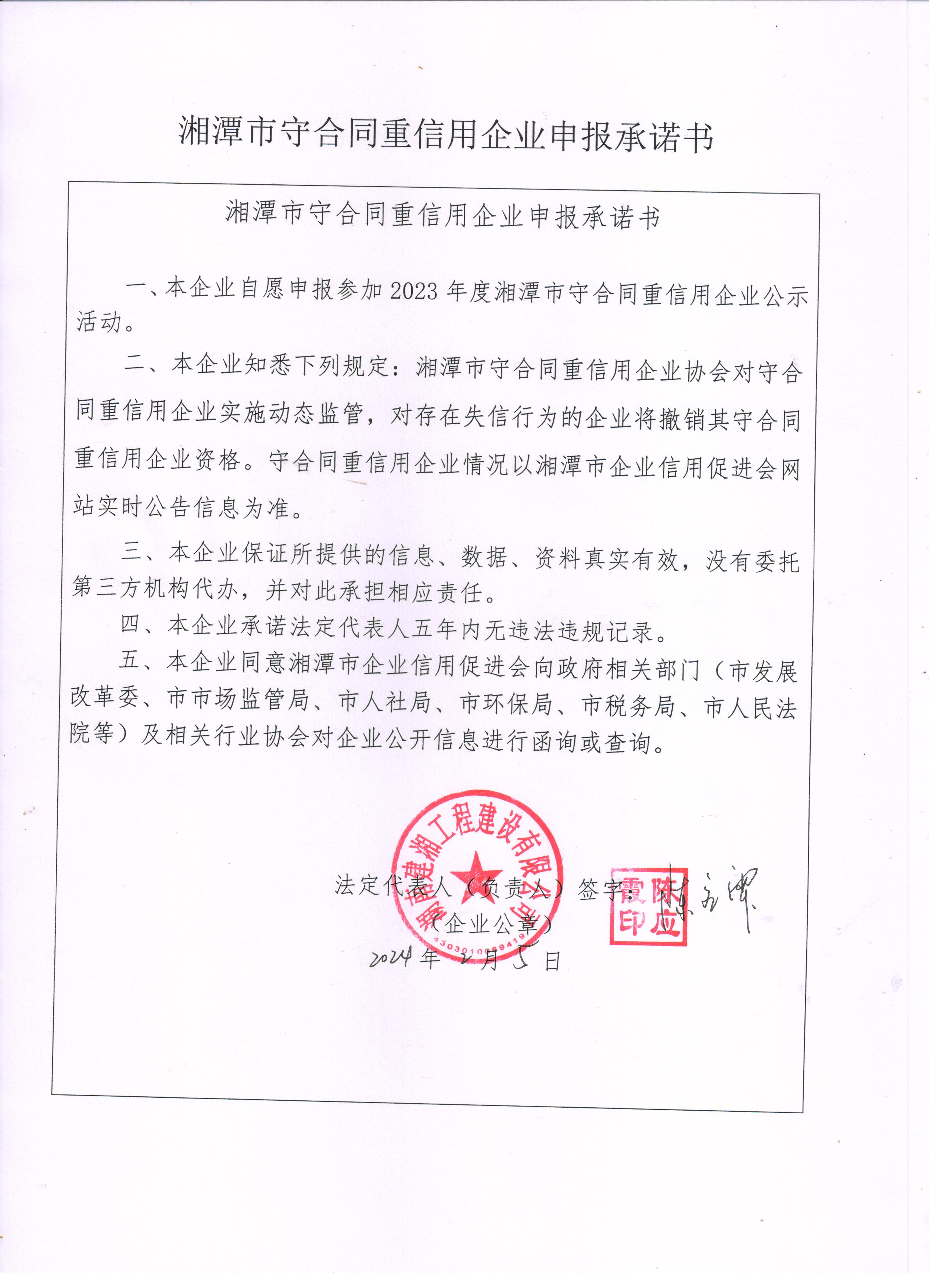 本企業(yè)根據(jù)《湘潭市守合同重信用企業(yè)申報(bào)規(guī)定》等編制 2023 年度企業(yè)信用報(bào)告書,并保證本報(bào)告書內(nèi)容真實(shí)、準(zhǔn)確、完整。