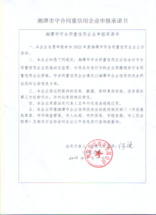 本企業(yè)根據(jù)《湘潭市守合同重信用企業(yè)申報規(guī)定》等編制 2022 年度企業(yè)信用報告書,并保證本報告書內(nèi)容真實、準確、完整。