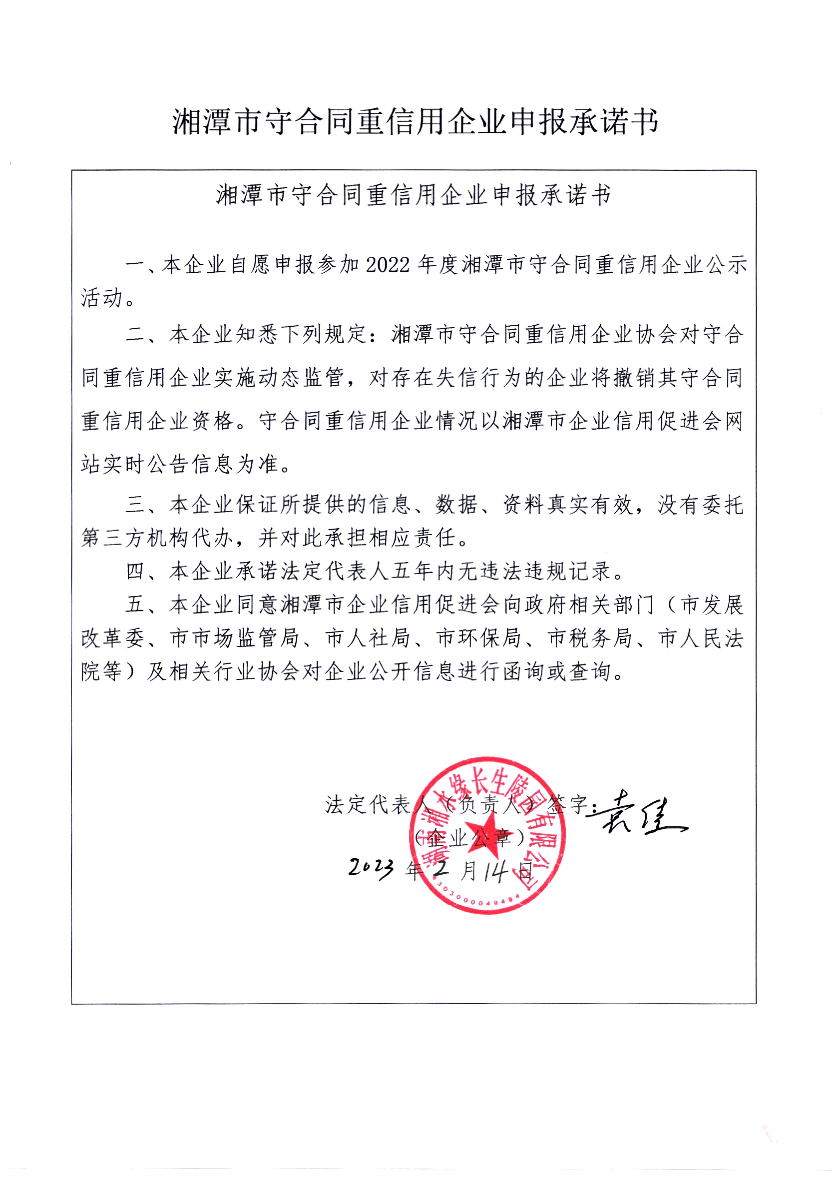 本企業(yè)根據(jù)《湘潭市守合同重信用企業(yè)申報(bào)規(guī)定》等編制 2022 年度企業(yè)信用報(bào)告書,并保證本報(bào)告書內(nèi)容真實(shí)、準(zhǔn)確、完整。