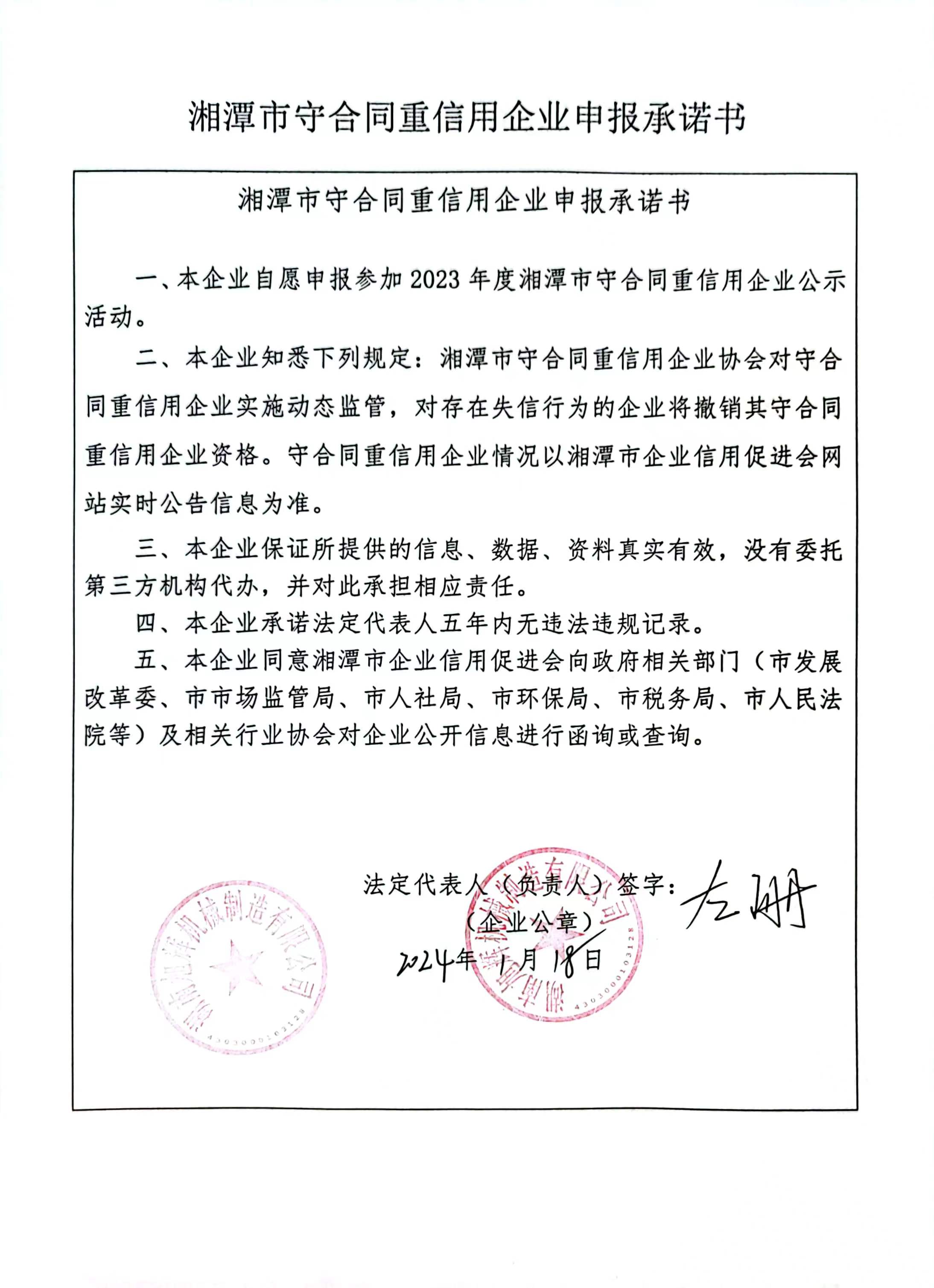 本企業(yè)根據《湘潭市守合同重信用企業(yè)申報規(guī)定》等編制 2023 年度企業(yè)信用報告書,并保證本報告書內容真實、準確、完整。