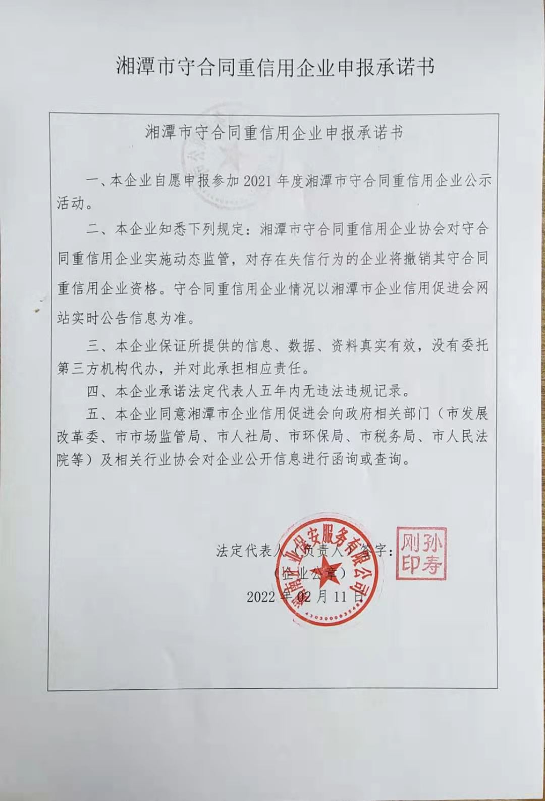 本企業(yè)根據(jù)《湘潭市守合同重信用企業(yè)申報規(guī)定》等編制 2021年度 年度企業(yè)信用報告書,并保證本報告書內容真實、準確、完整。