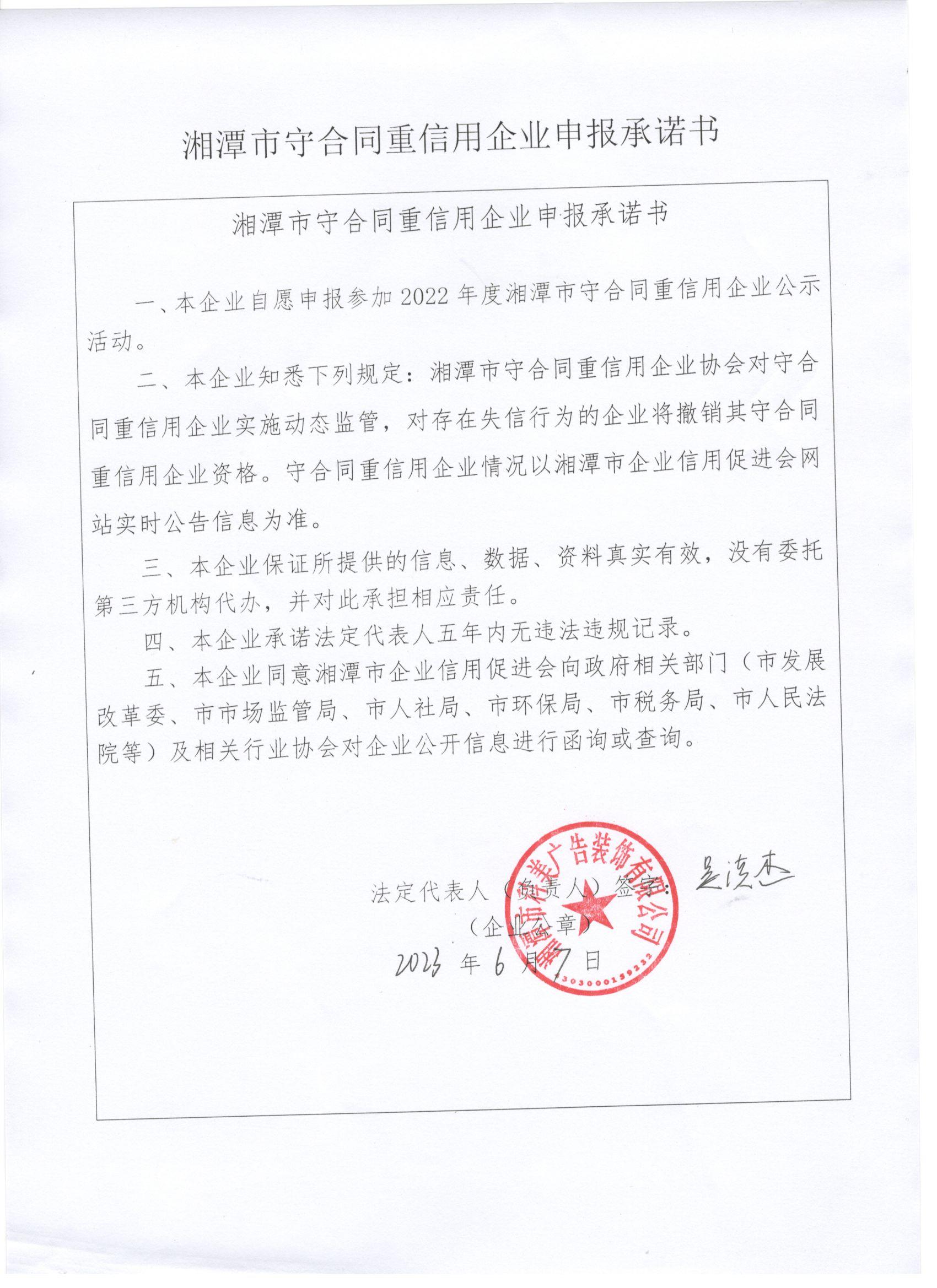 本企業(yè)根據(jù)《湘潭市守合同重信用企業(yè)申報(bào)規(guī)定》等編制 2022 年度企業(yè)信用報(bào)告書(shū),并保證本報(bào)告書(shū)內(nèi)容真實(shí)、準(zhǔn)確、完整。