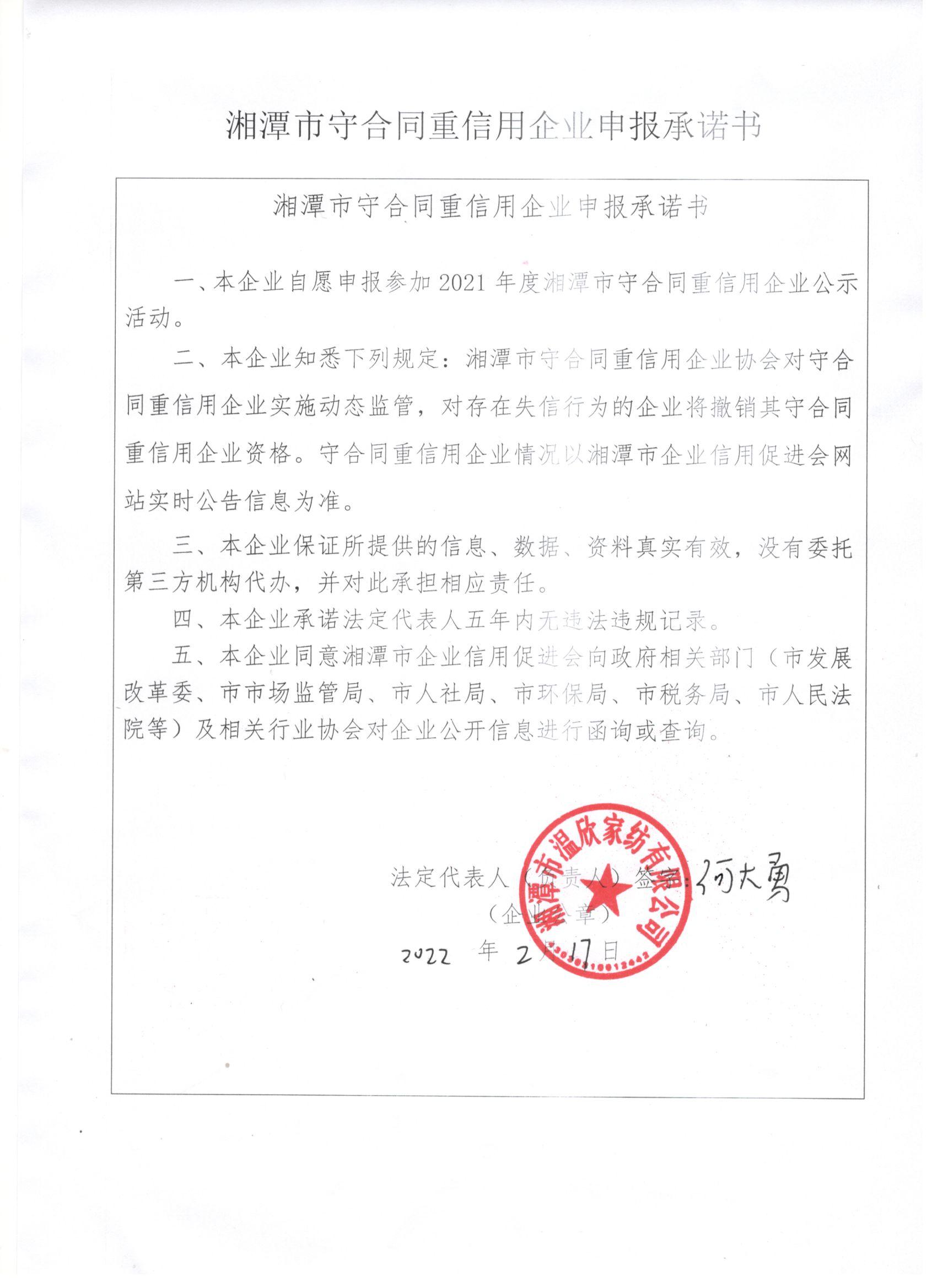 本企業(yè)根據(jù)《湘潭市守合同重信用企業(yè)申報(bào)規(guī)定》等編制 2021 年度企業(yè)信用報(bào)告書,并保證本報(bào)告書內(nèi)容真實(shí)、準(zhǔn)確、完整。